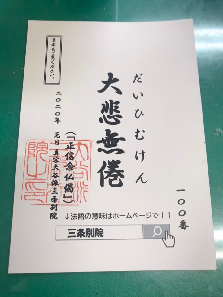 除夜の鐘整理券をお受け取りの皆さま、悪天候の中三条別院にお参りいただきありがとうございます。2019年はいろいろとお世話になりました。2020年もどうぞよろしくお願いします。さて、今年の一言は「大悲無倦(だいひむけん」です。大悲とは阿弥陀如来の慈悲。「無倦」とはものうきことなくということです。正信偈には「常照我」と続きます。さっそく語句を解説しましょう。