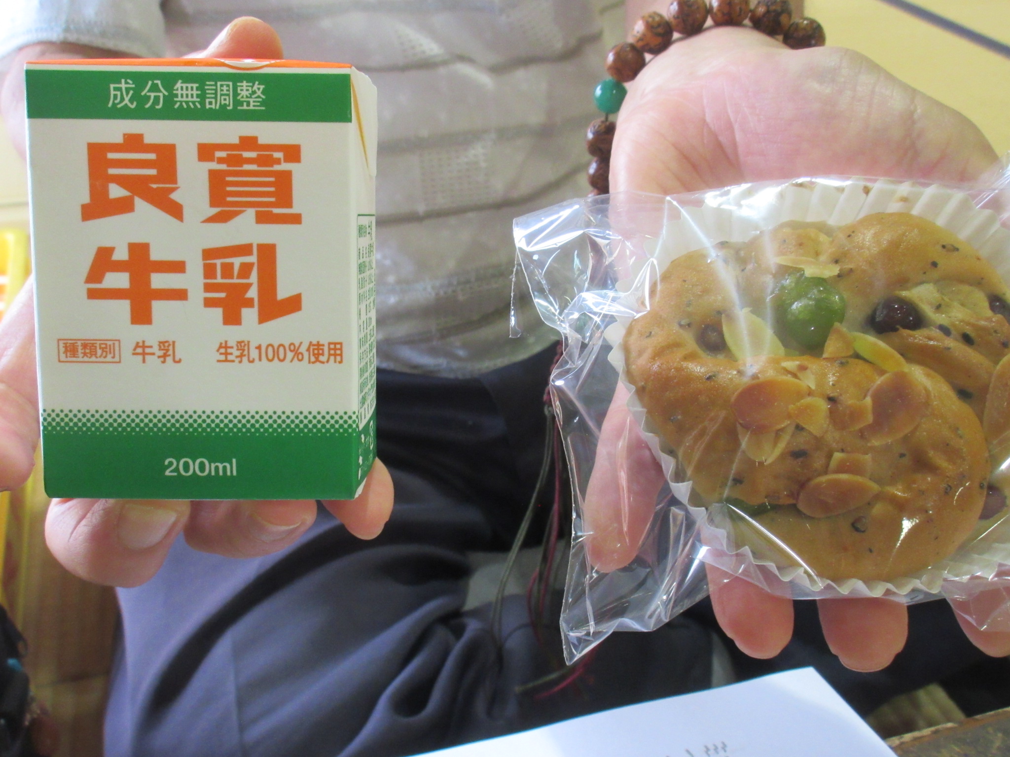 同時に2017年から中央商店街のコロネットに協力していただき、オリジナルのパンと牛乳を朝食として配布しています。今年は三条市役所健康づくり課食育推進室から「共食(きょうしょく)」を提案していただき、残っていただける参詣者と法話講師・輪番・職員で旧御堂でパンと牛乳を食べました。