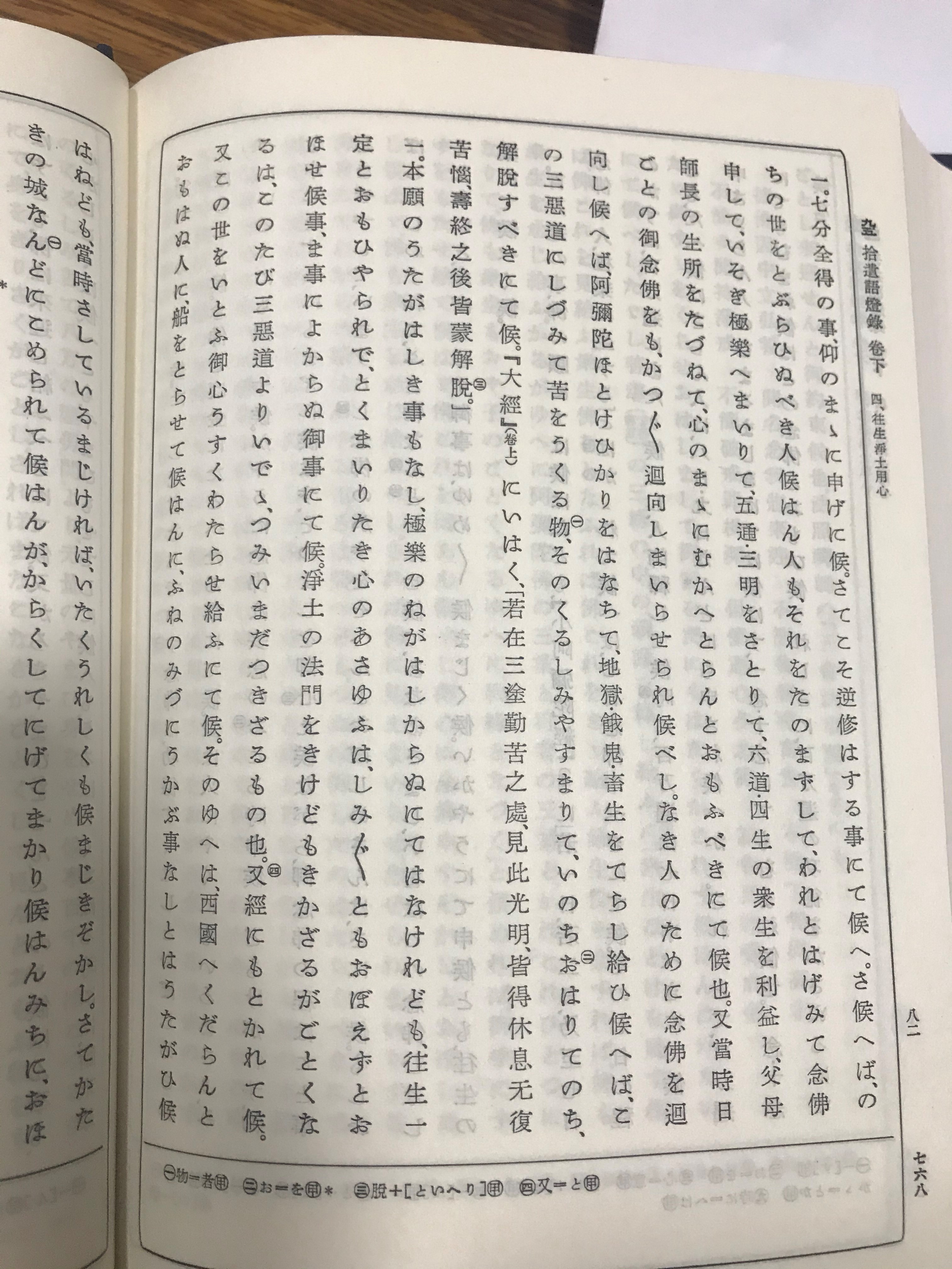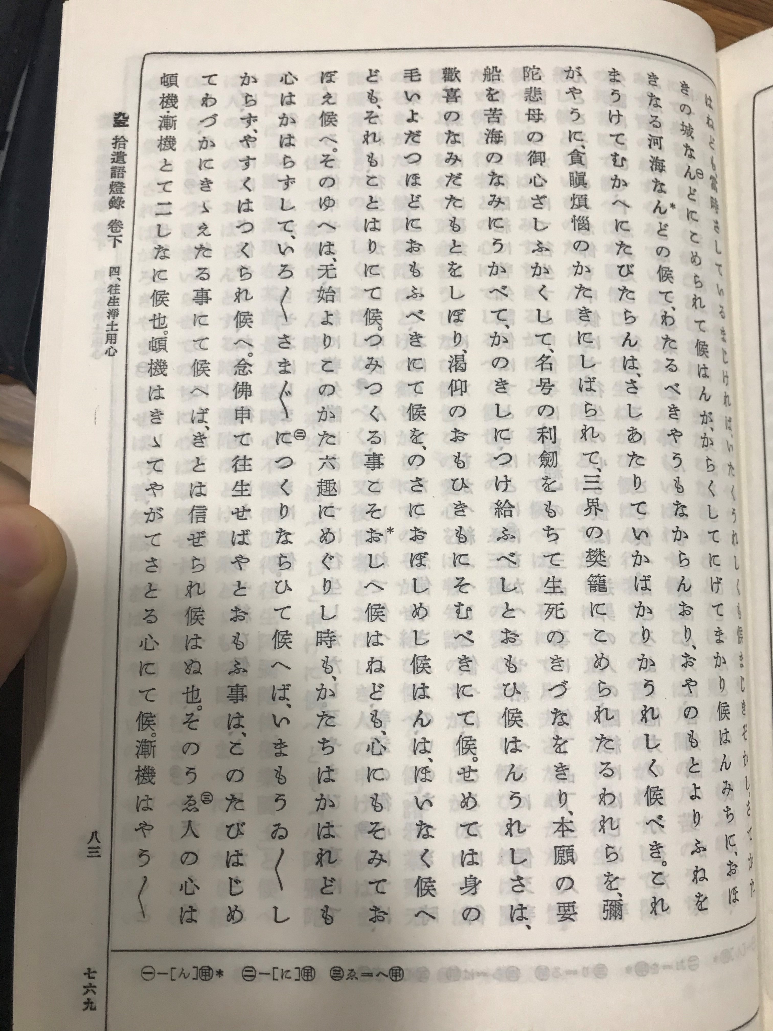 〇「久遠劫より今まで流轉せる苦惱の舊里はすてがたく」等。『口傳鈔』下十六已下[9]此の文と同じ。これは覺如上人の如信上人より御敎化を聞きて『口傳鈔』に載せたまふとみえたりに、これは『和語燈七』二十七右已下の御言を見るに、[10]無始より已來(このかた)、六趣に廻りし時も形は替れども心は替らずして色々様々に造り習ひて候へば、今もういういしからず易くは作られ候へ。念佛申して往生せばやと思ふ事は今度(こた)び始めて纔(わずか)に聞き得たることにて候へば、急とは信ぜられ候はぬなり」等の御語あり。此の『和語燈』は罪を造ると念佛申すとを對待して云ひ、此の鈔は娑婆を厭ふと淨土を欣ぶこころとを對待して云へり。其の言は異なれども意は同じことなり。我等凡夫は久遠劫より馴れたる娑婆ゆへ名殘をしく、安樂淨土は今度初めて往生する淨土故に戀しからずと云ふ意は『和語燈』と同意なり。