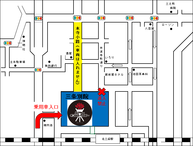 当日は上記経路図のように、三条別院東門から乗用車でお入りください。