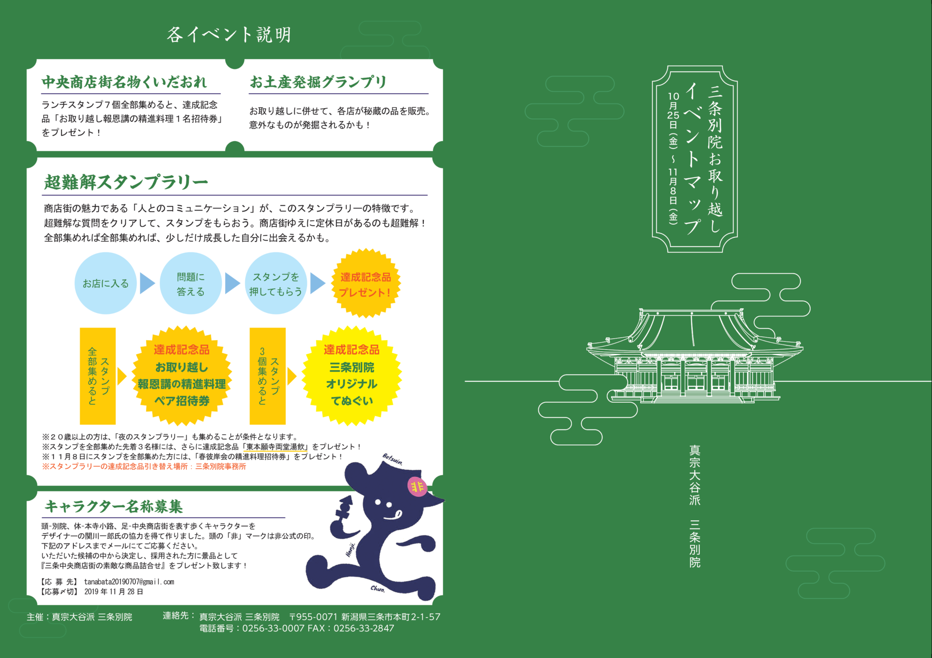 お取り越し報恩講が11月5日(火)から8日(金)まで勤められます。今年も三条中央商店街と協力した、超難解スタンプラリーがはじまります!今年の期間は10月25日(金)から11月8日(金)と2週間!ただのスタンプラリーではなく商店街のお店とのコミュニケーションを要する「超難解」スタンプラリーです。大人は「夜のスタンプラリー」もあります。三条別院と三条中央商店街からの挑戦状に、ぜひひるむことなく立ち向かってみてください!